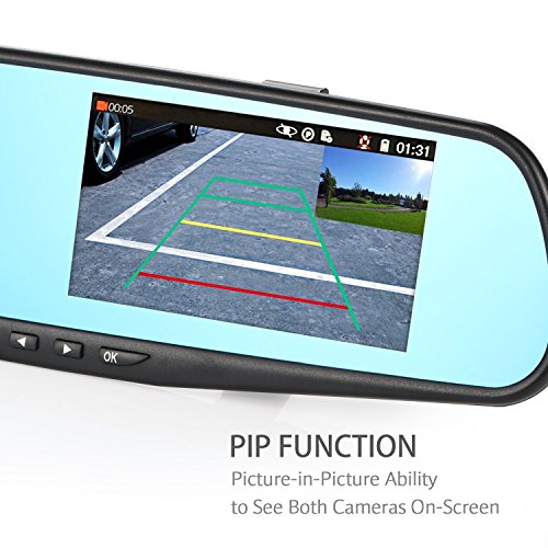 - PICTURE-IN-PICTURE DISPLAY: The large mirror display screen can display a single image with footage from one camera, or picture-in-picture display from both camera as recorded simultaneously. Thanks for the one-button switch design, you can switch the view mode quickly from either full screen display of front /rear view or picture-in-picture display.
